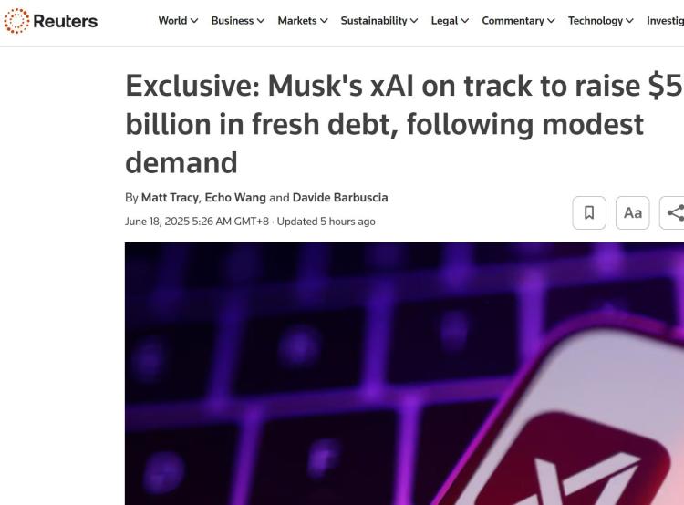 【环球网科技综合报道】6月18日消息,据路透社报道称, 知情人士透露,尽管投资者需求不温不火,伊隆·马斯克的人工智能公司xAI仍有望完成由摩根士丹利牵头的50亿美元债务融资。这笔债务包括浮动利率定期贷款、固定利率贷款和担保债券。